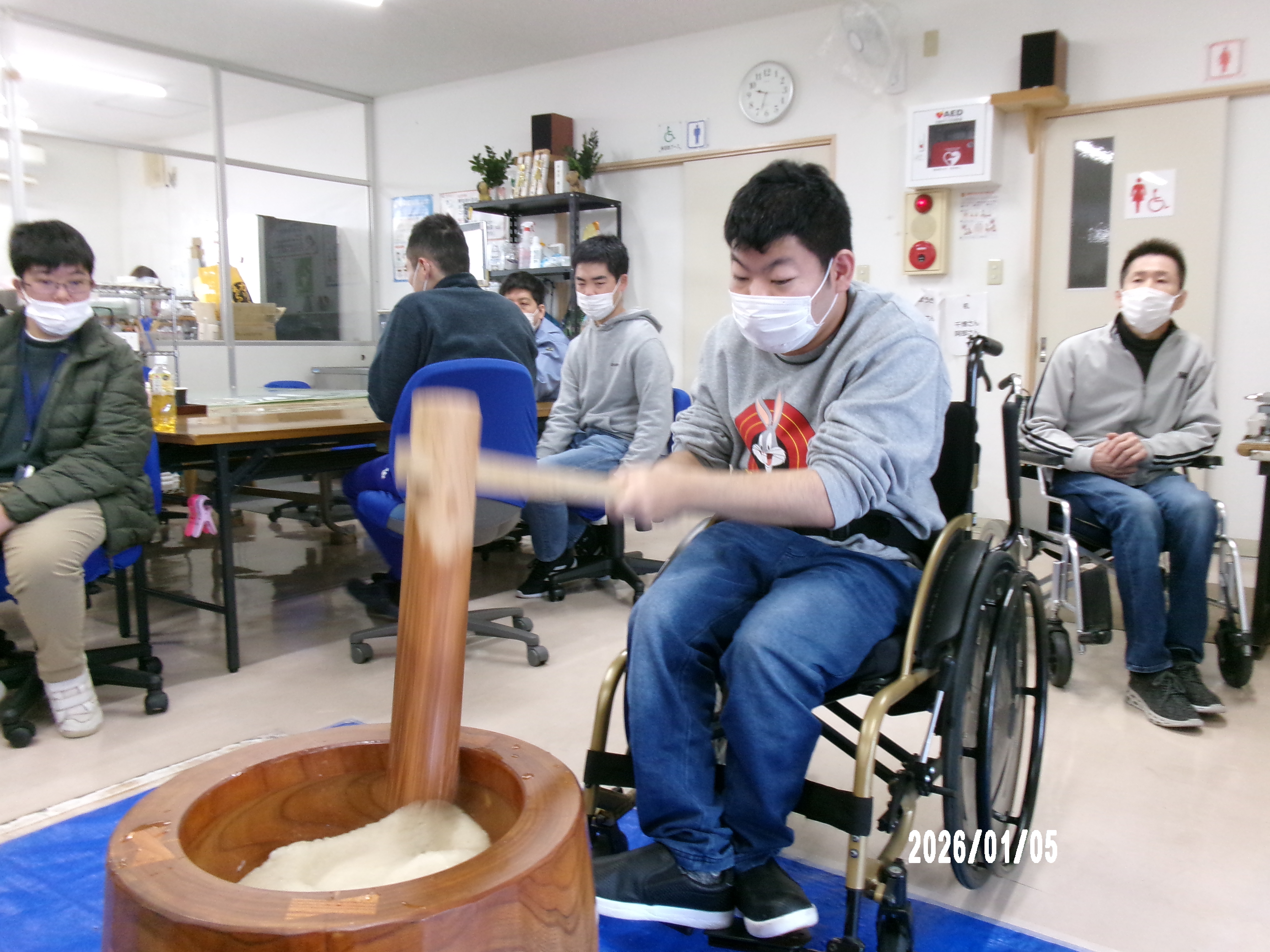 2026年1月5日 新年餅つきを行いました(^^)/皆さん力強く杵で餅をついていました!!納豆、あんこ、きな粉を美味しくいただきました~♪お餅が食べられない利用者さんには、おはぎも用意しました♪