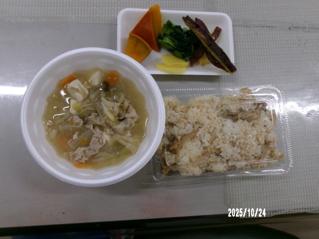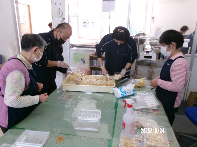 2025年10月24日 「昼食会」を行いました。混ぜご飯・豚汁・漬け物・カボチャ煮・サツマイモスティックと秋の味覚を皆で美味しくいただきました♪今回も利用者さんにも調理のお手伝いをもらいました~♪