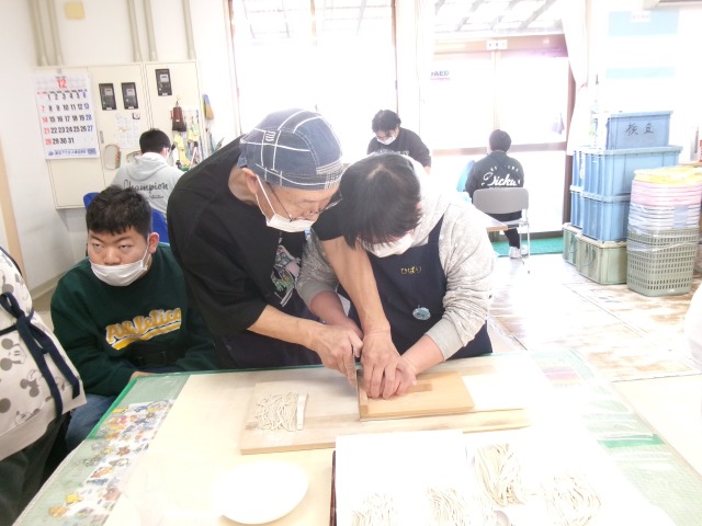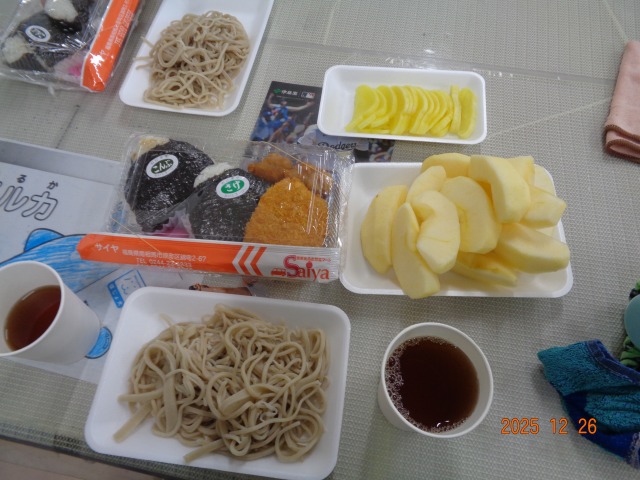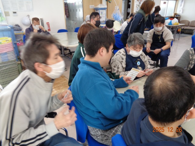 2025年12月26日 今日は仕事納めの日でした。行事「昼食会&ビンゴ大会」を行いました。昼食会では今年も職員が手打ちそばを御馳走してくれました。利用者さんも一緒にお手伝いをし、そば打ち体験をしました(^^♪とても美味しかったです!午後はビンゴ大会!!大盛り上がりでした~(^^♪