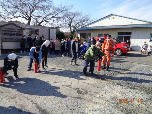 2025年11月14日 「防災訓練」を実施。皆さん落ち着いて訓練に取り組んでいました。水消火器を使用し消火訓練も行いました。「ピンポンパン」のかけ声で上手に出来ていました!