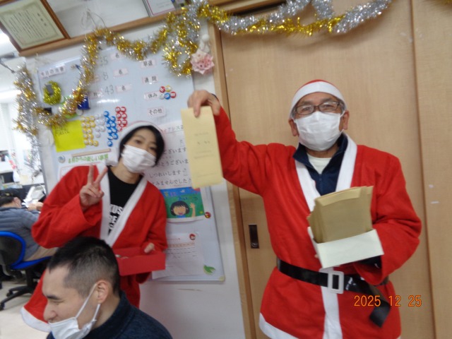 2025年12月25日 「ひばりにサンタクロース🎅がやってきた☆」今日は利用者さんたちの工賃支給日。終礼の時にサンタさんがやってきてくれました♪サンタさんから工賃を受け取り大喜びでした(^^♪