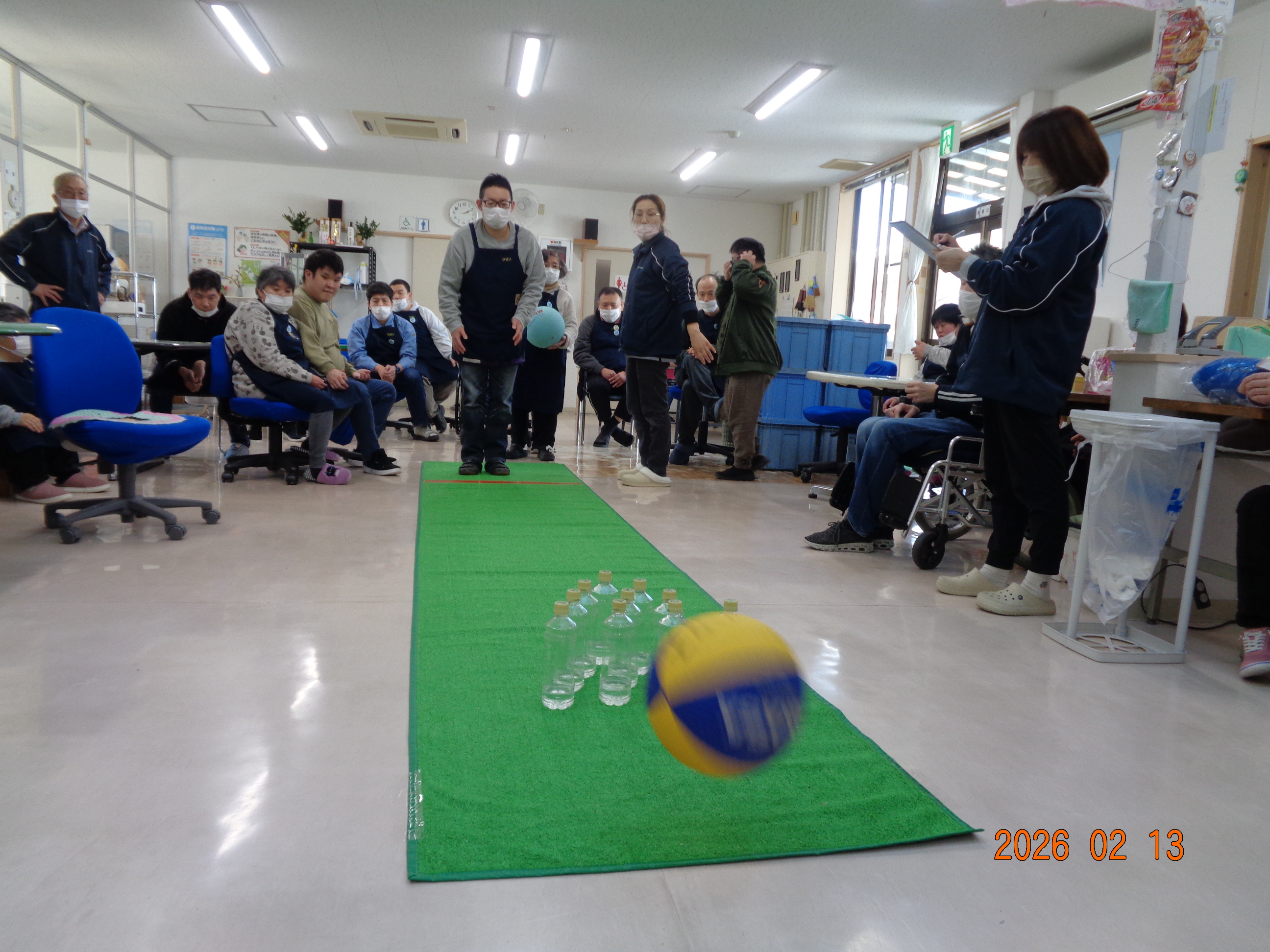 2026年2月13日 今月の行事は「セレクトお弁当・レクリエーション」でした。5種類のメニューから好きなお弁当を選択し皆で美味しくお弁当を食べました♪午後は「スカットボール・ボーリング」の2種目で「ひばりンピック」を開催しました。男女の上位3名には缶バッチをプレゼントしました(^^)/